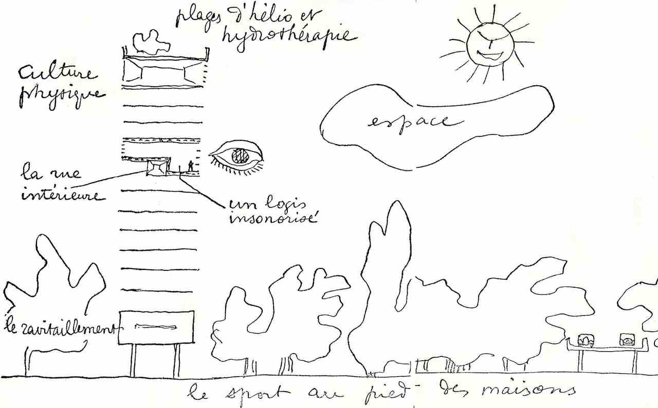 Process: the empathetic subject empties outward, discharging a burst of energy that shines up the spine, rattles through the antennae and, materializing light as a carrier of sight, cuts right through sympathy’s sovereign space of difference to penetrate the object of study. The act of empathy is phenomenological down to the ground. For instance, see Le Corbusier’s drawing of a stick person made mobile through the discursive extra-agency of a detachable eye: