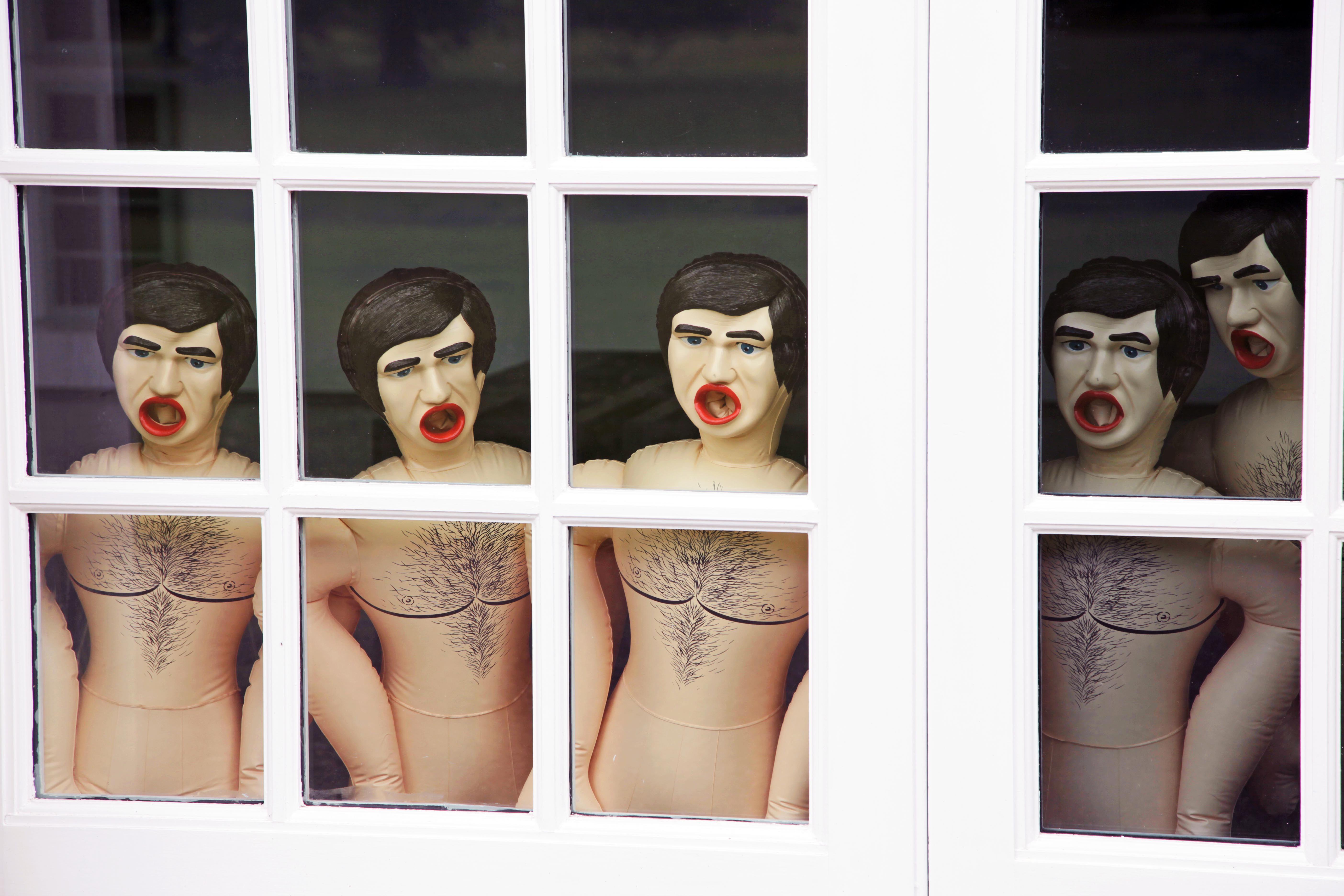 Objecthood veers close in this room. Nineteen monitors, some boxy, some flat, converse behind the backs of sixteen Italianate, hairy-chested dolls. Shut your eyes and you hear (simultaneously) a gaming arcade; a 90s breakbeats compilation, cartoon laughter and, from the following room, the drugged thump of a nightclub. No wonder the Sex Dolls (2012) want to bust out, they’ve watched too much television. Hal Foster turns round and calls this a clean death: I don’t get the joke.