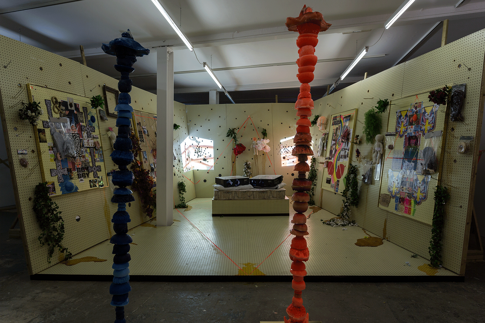 The Eleventh Hobby comprises a walk-in installation; two totemic floor sculptures; a series of wall-mounted collage works and, finally, a vertiginous loop that orchestrates your body like an in-store experience, drawing the host of discrete objects into one melodramatic play.